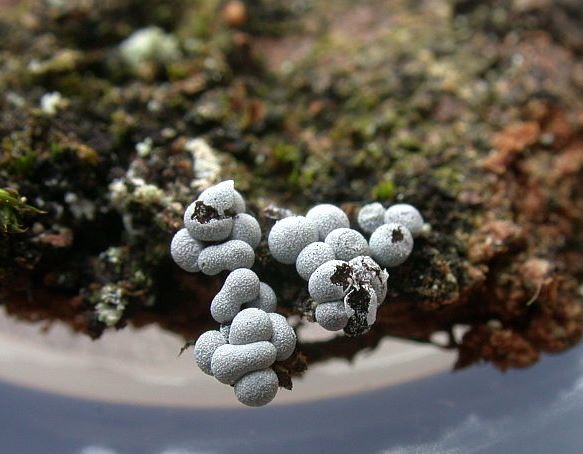 Es gibt mehrere Schleimpilzarten mit rundlichen Fruktifikationen. Auch die grauweiße Farbe ist kein verlässliches Merkmal. Sie verändert sich bei der hier abgebildeten Art im Alter zu dunkel grau. Außerdem reißen die Fruchtkörper auf, um ihre schwärzlichen Sporen freisetzen zu können. Dabei wird auch das weißliche Netz des Capillitiums sichtbar. Bei Badhamia panicea besteht es aus kräftigen grob granulierten Kalksäulen. Die nur 1 – 1,5 mm großen Sporocarpien sitzen ungestielt oder nur sehr kurz gestielt in überwiegend aneinander gedrängten Knäueln auf ihrem Substrat, einzelne können aber auch frei stehen. Als Substrat kommen überwiegend liegende Laub- oder Nadelholzstämme in Betracht. Auch feucht liegende Holzspäne sowie Moose, Flechten oder Pflanzenreste können besiedelt werden. Haupterscheinungszeit ist Herbst bis Spätherbst. Die Art gilt als selten.