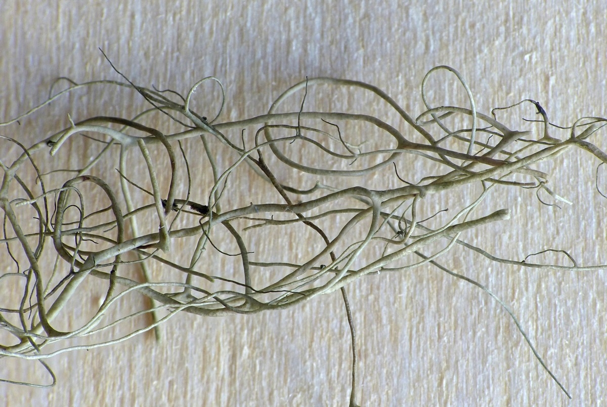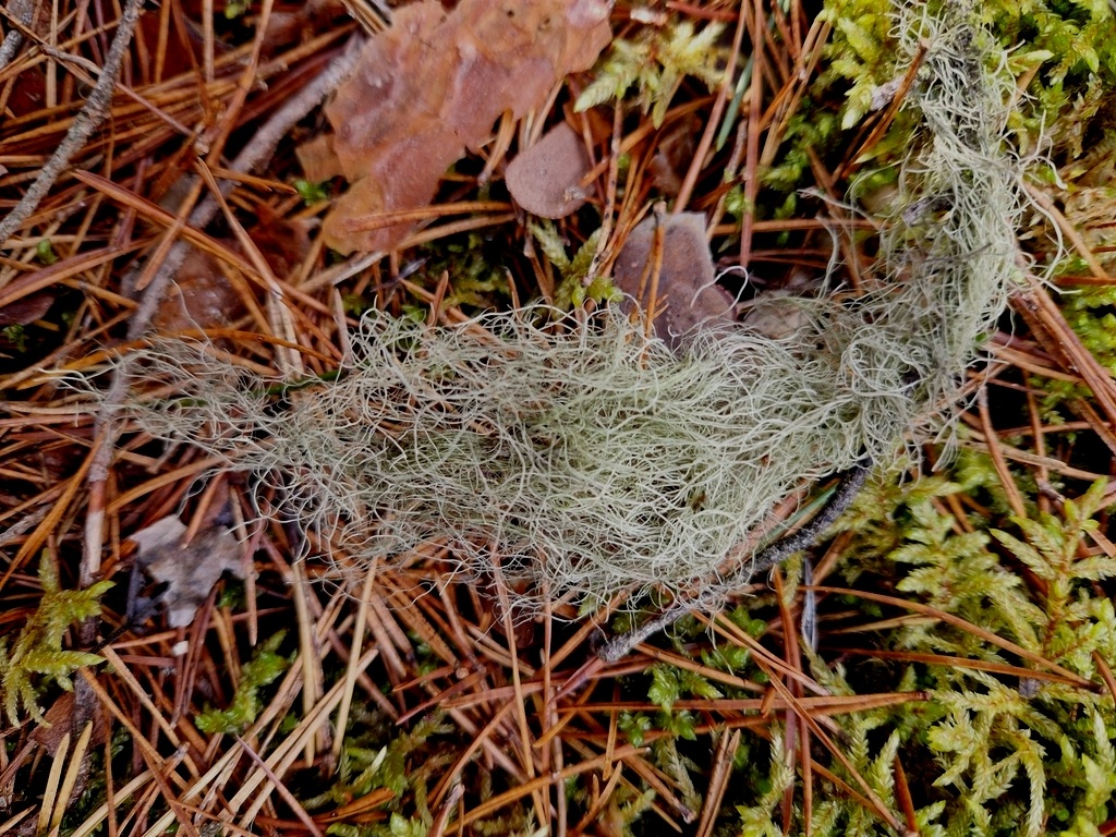Wir fanden sie am 21. Februar 2025 bei einer Kartierung im Nordschwarzwald in einem lichten Kiefernwald auf saurem, torfigem Boden, in etwa 720 mNN. Beim fleißigen Absuchen des Bodens stießen wir auf eine 15 cm lange Bartflechte, die an einem dünnen Kiefernzweig angeheftet war (siehe Foto oben).