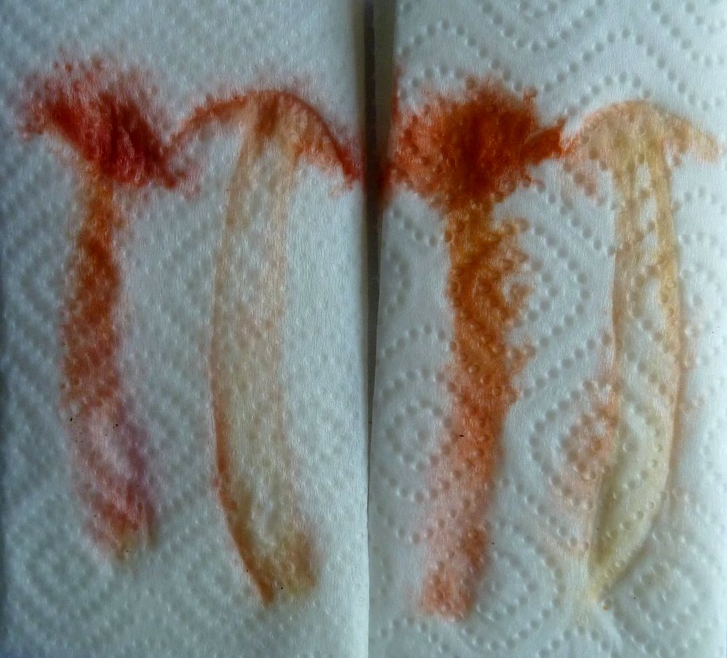 Vorgehensweise: Ein frischer Fruchtkörper wird längs halbiert. Die beiden Hälften werden nebeneinander, die eine Hälfte mit Lamellenseite nach unten, die andere mit Lamellenseite nach oben, auf ein mit Alkohol (z.B. Brennspiritus) getränktes, reinweißes Zellstoff-Taschentuch gelegt. Mit einem zweiten mit Alkohol getränkten Taschentuch wird das Ganze abgedeckt und mit einer Hand für 10 - 20 Sekunden angedrückt. Obige Abbildung links zeigt das Ergebnis bei Cortinarius malicorius. Setzt man sofort danach die Oberflächen der Taschentücher Ammoniakdämpfen aus, bekommt man ein Ergebnis, wie es die Abbildung rechts zeigt.