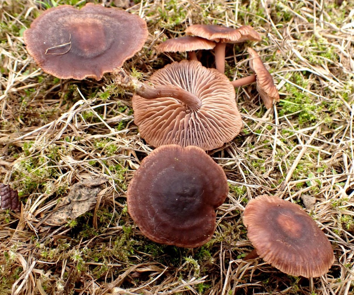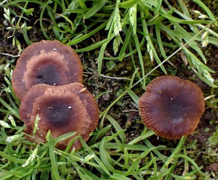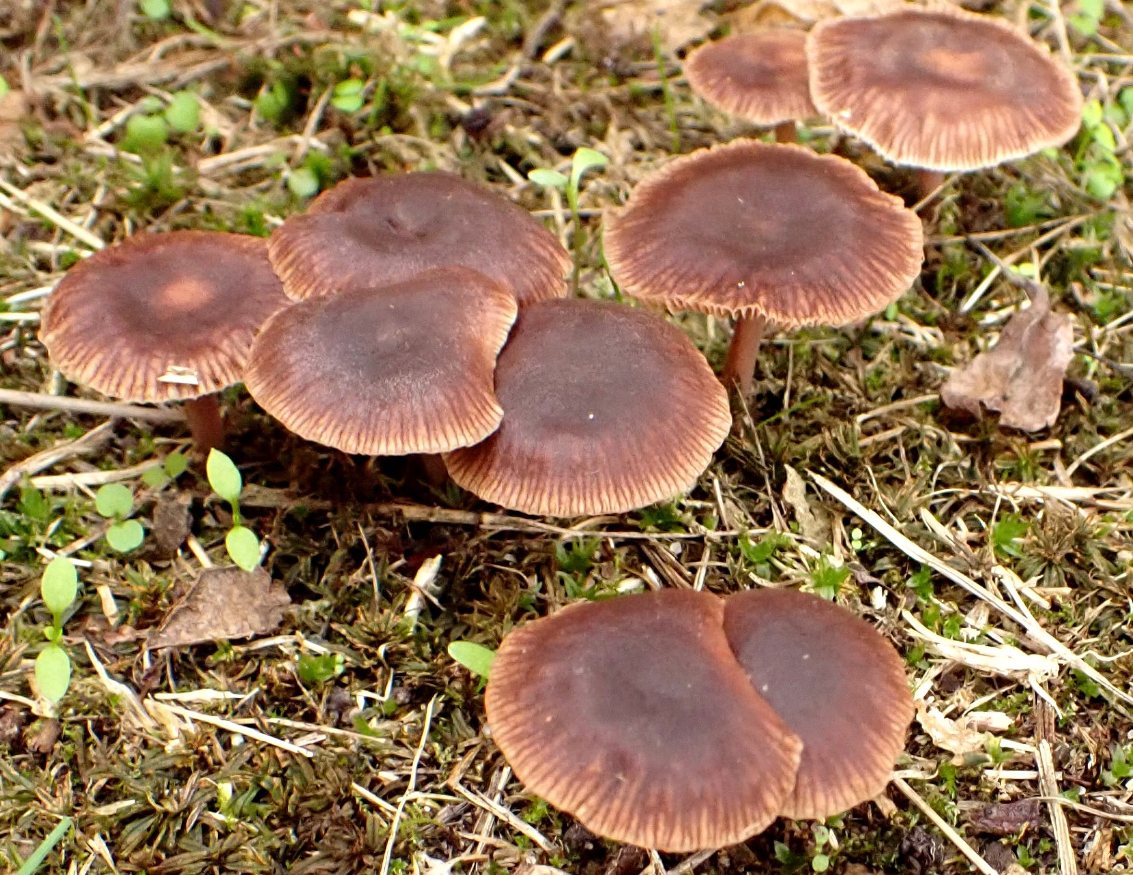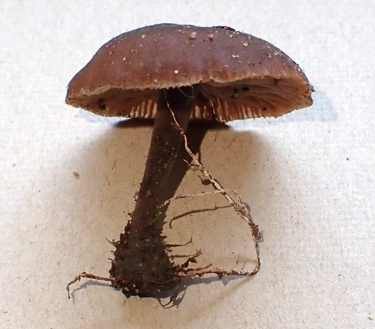 Die 2 - 3 cm breiten Hüte waren in der Mitte zumeist etwas vertieft, ihre schokoladenbraune Farbe war zum gerieften, etwas herabgebogenen Rand hin heller. Aufgrund ihrer Hygrophanität verblassten die Farben beim Trocknen. Die rosabräunlichen etwas bauchigen Lamellen waren mehrfach mit Lameletten untermischt und am Stiel leicht ausgebuchtet angewachsen, die Lamellenschneide heller als die Fläche. Die rotbraunen oft etwas verbogenen Stiele waren zäh und hohl und zur Basis hin weißfilzig. Auffällig war die am Exsikkat eintretende Farbänderung. Die Hutoberseiten wurden grau, die Lamellen nahezu schwarz. Das Sporenpulver war weiß.