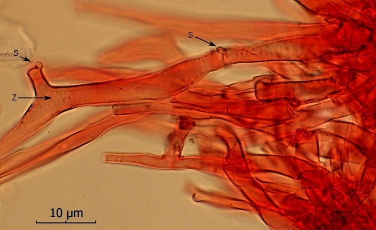 Der Hymenialbereich besteht aus schlanken, teils kopfigen, teils keuligen 2- und 4-sporigen Basidien mit Basalschnallen. An der Lamellenschneide sind zudem dünnwandige Marginalzellen spärlich vorhanden (Fotos oben).