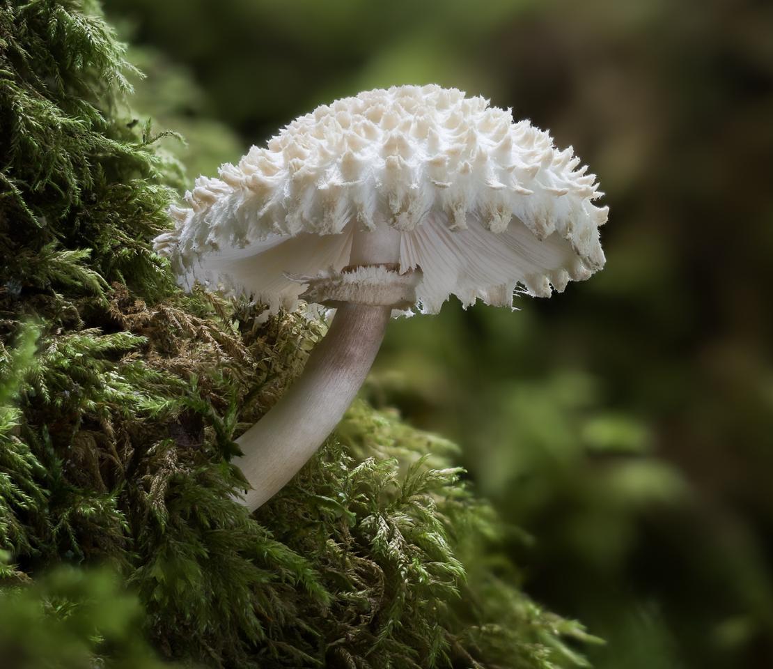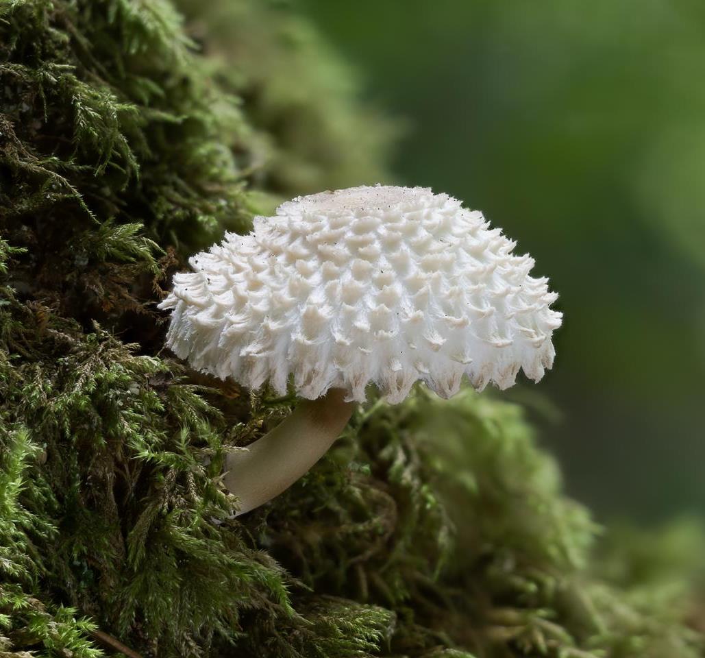 Ein wunderschöner Pilz – besonders wenn er so perfekt mit der Kamera eingefangen worden ist wie hier von Christian Weinkötz. Leider werden den allermeisten Pilzfreunden solche Anblicke versagt bleiben. Der Jungfernschirmling Leucoagaricus nympharum ist eine seltene Art. Wenn man den wattigen und sogar verschiebbaren Stielring betrachtet, denkt man unwillkürlich an einen Riesenschirmling der Gattung Macrolepiota. Hier war er früher auch angesiedelt, bis er 1977 vom französischen Mykologen Marcel Bon in die Gattung Egerlingsschirmlinge (Leucoagaricus) transferiert wurde.