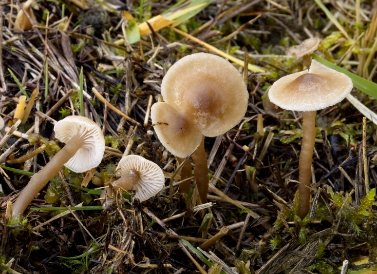 Zur Bestimmung: Mit Gröger (2006) und FN geschlüsselt. Vgl. PdS3 Nr. 266, Ludwig 44.25 sowie eine sehr schöne Dokumentation von Massimo Biraghi e Angelo Mariani. Letztere haben ebenfalls divertikulierte HDS-Hyphen festgestellt und präsentieren eine makroskopisch nahezu identische Kollektion. Die Art wird normalerweise auf verrottenden Laublättern gefunden, hier fruktifizierte sie in einer nassen moosigen Wiese. Funddaten: 07.11.2020; MTB 8134-3-2-3, 670 m; Koordinaten: 11° 22’ 41,56’’ E, 47° 50’ 2,86’’ N; D – By – Landkreis Bad Tölz-Wolfratshausen, Gemeinde Eurasburg, Impleiten, Impbühl; nasse Moorwiese, teils mit Sphagnum; in der moosigen Wiese, nicht direkt im Sphagnum; verges. mit Atheniella adonis; Hut: bis 1,8 cm breit, konvex bis ausgebreitet und meist mit breit warzenförmigem Buckel, trocken und glatt, am Scheitel kastanienbraun, zum Rand hin immer heller, bis beige, hygrophan, vor allem im Randbereich felderig-fleckig cremefarben verblassend, nur am Rand schwach durchscheinend gestreift, Stiel: bis 3,5 x 0,3 cm, basal schwach verjüngt, +/- glatt und kahl, olivbraun (apikal starker Farbkontrast zu den weißen Lamellen; Lamellen: recht variabel im Ansatz, aufsteigend oder gerade bis etwas bogig angewachsen, bisw. mit Zahn herablaufend, gedrängt (ca. 28 erreichen den Stiel), cremeweiß; Geruch: im Feld stark ranzig-mehlig, nach Lagerung über Nacht und im Schnitt nur schwach; Mikromerkmale vom Exsikkat: HDS: Cutis, Zellen in den obersten Lagen schwer zu beurteilen, im Dünnschnitt gerade so erkennbar, ca. 2,6-5,1 µm breit, mit einigen Auswüchsen, vermutlich großteils gelifiziert, bilden in dickerer Lage in Scheitelnähe eine amorphe Masse, in der auch nach Anfärben mit Kongo kaum Zellwände zu sehen sind; Pigment sehr auffällig granulär gelb; Schnallen vorhanden; Lamellenschneide: fertil, ohne Zystiden; Lamellentrama: Zellen auffallend voluminös; Basidien: 4-sporig, siderophil, mit Schnallen, ca. 20-22 x 5-6; Sporen: schlank ellipsoid, glatt, nicht kongophil, inamyloid, Maße: 6,0 x 3,1 (5,5-6,7 x 2,9-3,4), Q=1,95 (1,77-2,17), 20 Sp. vom Abwurf gemessen.